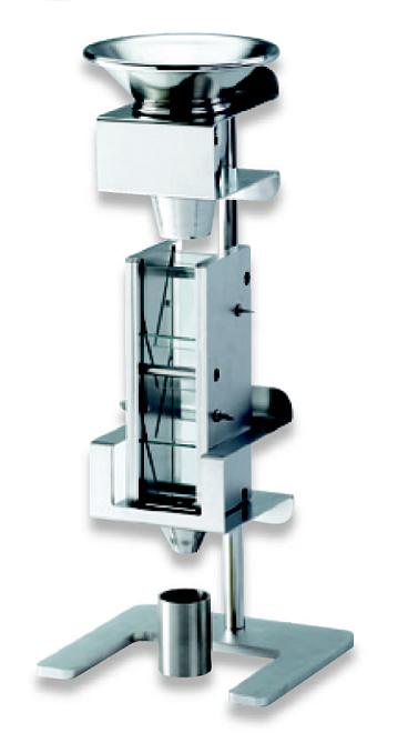 由于微小的干扰会引起测量结果的变化,所以体积密度的测量相对比较困难,它与决定粉末体积的颗粒大小有关,也与粉末的流动性有关,体积密度就是粉末样品倾注到测试杯后的密度;另一方面,振实密度是样品在振动后达到捣紧后的密度,通过体积密度和振实密度的比较,可以得到不同颗粒大小的流动特性。体积密度仪是根据根据美国药典616章方法2的要求而设计,用于测量细的粉末或类似样品的体积密度。